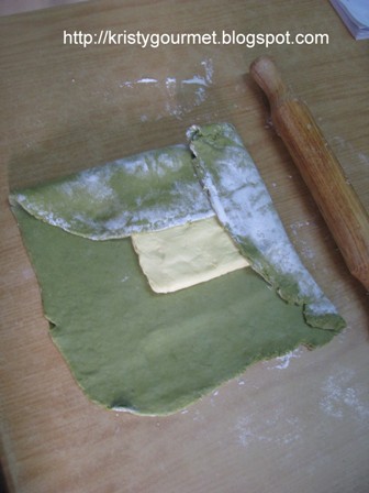 (4) now, flatten green tea dough by rolling it into the size slightly bigger than the butter. Next, roll & flatten even more for all corners which the center is still thick.